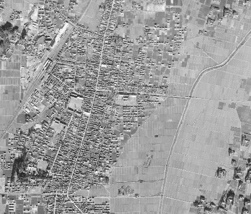 南北を貫いている道路は現在の国道4号線ではなく、今の旧4号線です。まだ4号線がありません。駅が出来たのはだいぶ早かったですから、駅の近くから徐々に発展してという形ですね。中央やや左の空いている土地が「岩沼小学校」です。