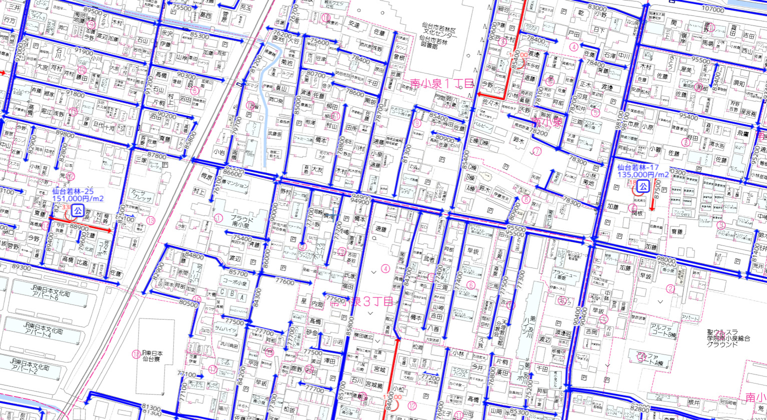画像左真ん中には青地で「仙台若林-25」151,000/㎡とありますが、こちらは文化町の公示価格です。南小泉よりやや高いですね。